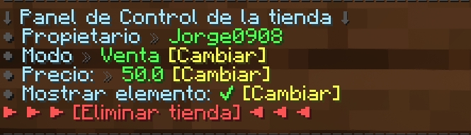 Una vez creada tu tienda, puedes editarla usando shift click-derecho, esta combinación de teclas te abrirá el siguiente menú donde puedes cambiar entre Vender o Comprar, cambiar el Precio y/o Eliminar la tienda.