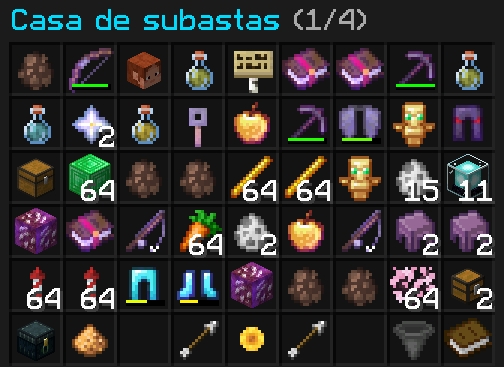 Si necesitas dinero puedes vender objetos en nuestro sistema de subastas con el comando /ah sell [precio] con el ítem en tu mano, podrás ver los objetos de los demás en el siguiente apartado utilizando el comando /ah.
